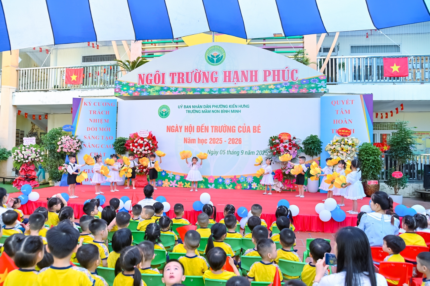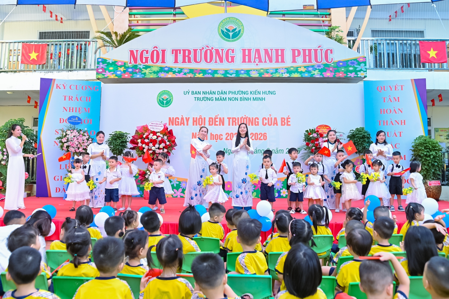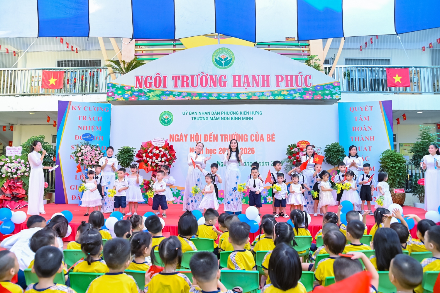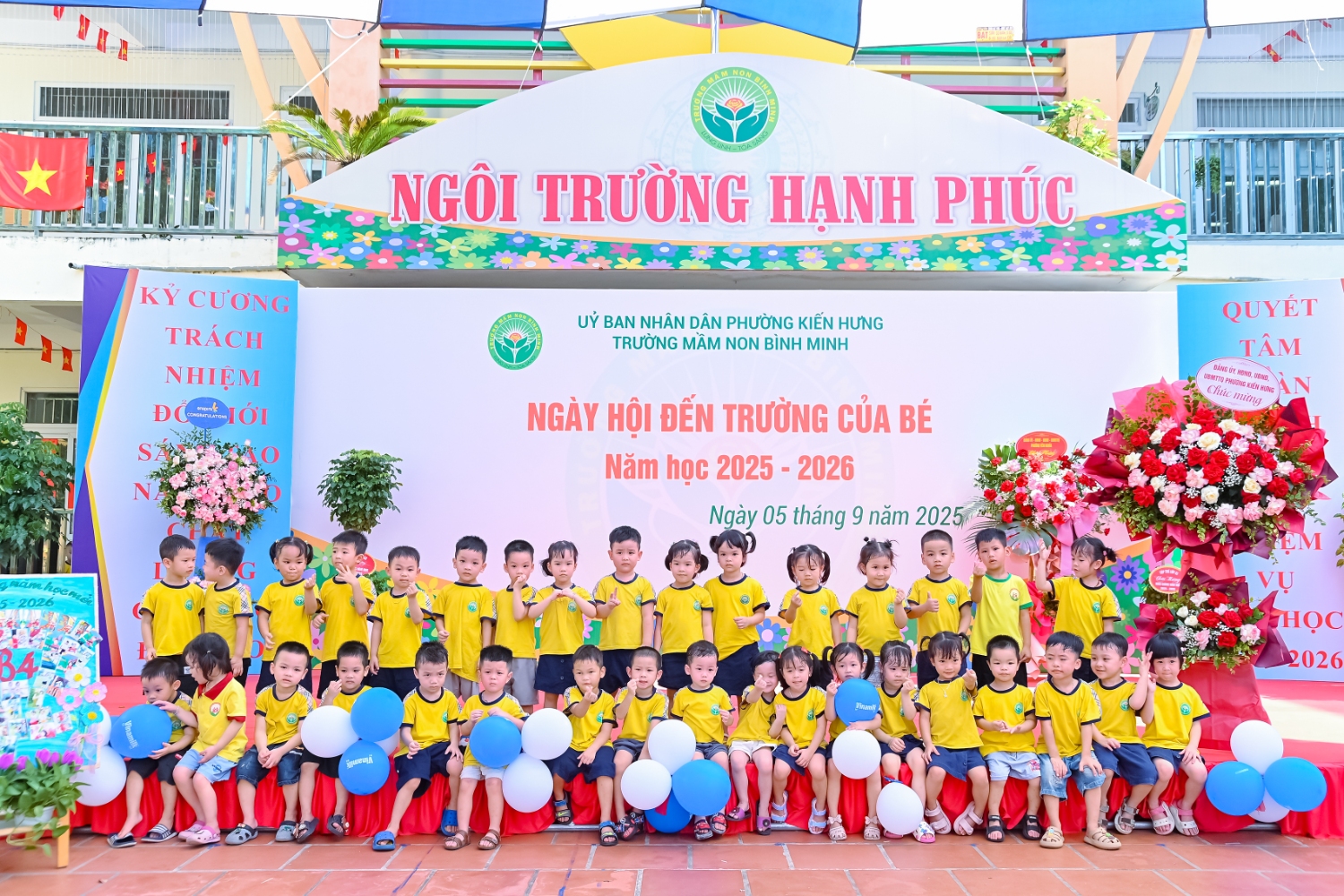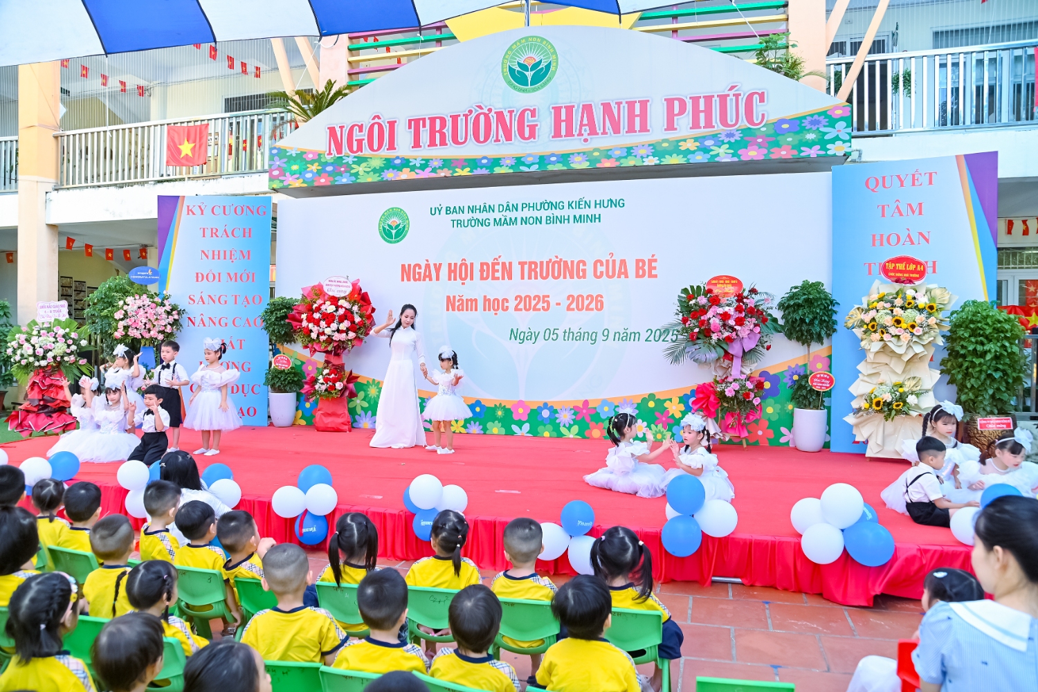 Sáng ngày 5/9/2025, trường Mầm non Bình Minh, phường Kiến Hưng, thành phố Hà Nội đã long trọng tổ chức lễ khai giảng năm học mới 2025 – 2026 trong không khí rộn ràng, hân hoan của thầy cô, phụ huynh và các em nhỏ. Sân trường được trang hoàng rực rỡ với cờ hoa, bóng bay và những tiết mục văn nghệ ngộ nghĩnh, đáng yêu do chính các bé biểu diễn. Buổi lễ diễn ra ấm áp, trang trọng nhưng vẫn gần gũi, tạo cho các con một kỷ niệm đầu năm học thật vui tươi và tràn đầy hứng khởi. Năm học mới, tập thể cán bộ, giáo viên và học sinh trường Mầm non Bình Minh quyết tâm tiếp tục phấn đấu, xây dựng môi trường học tập an toàn, thân thiện, góp phần nâng cao chất lượng giáo dục, để mỗi ngày đến trường thực sự là một ngày vui.