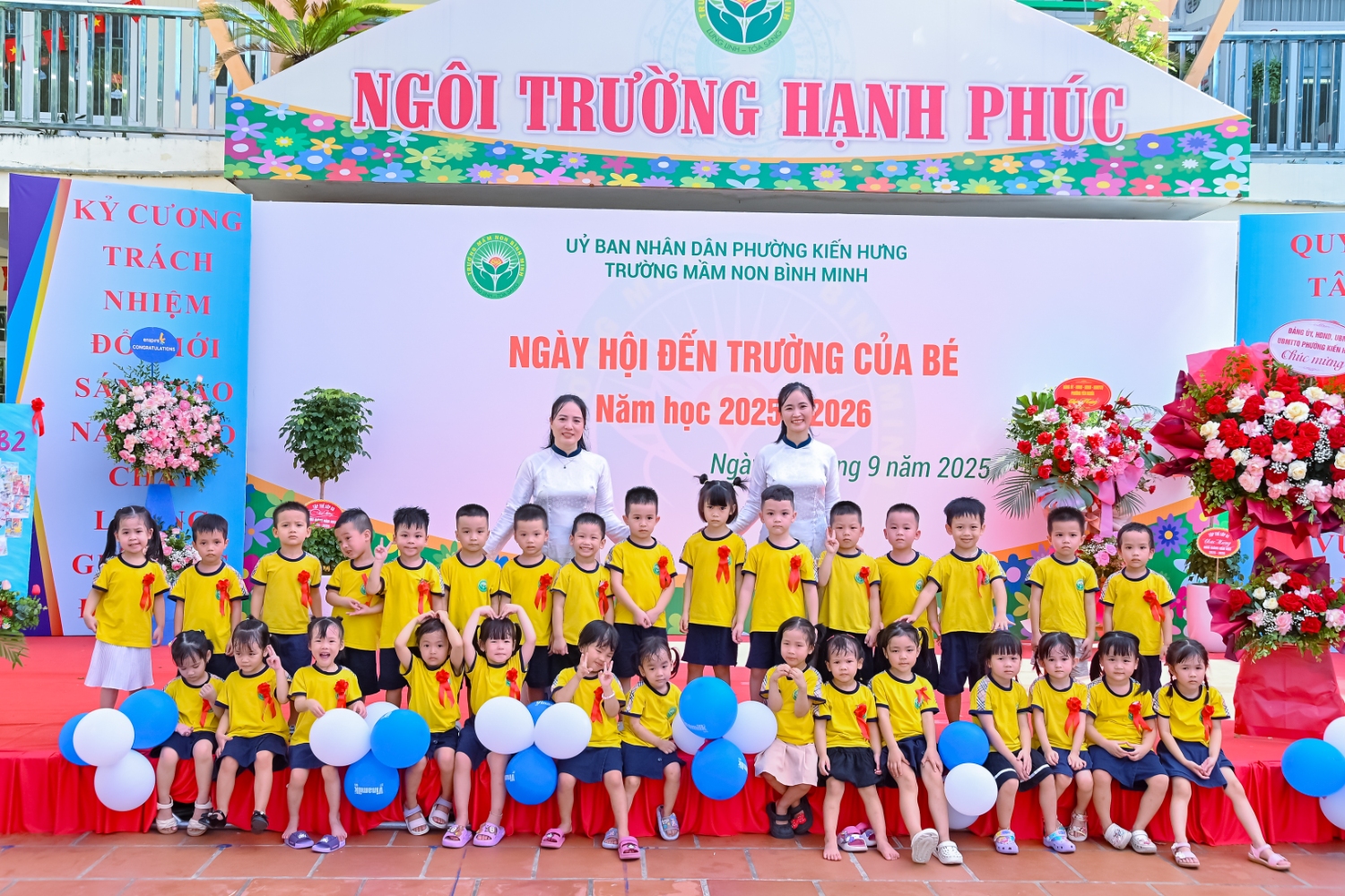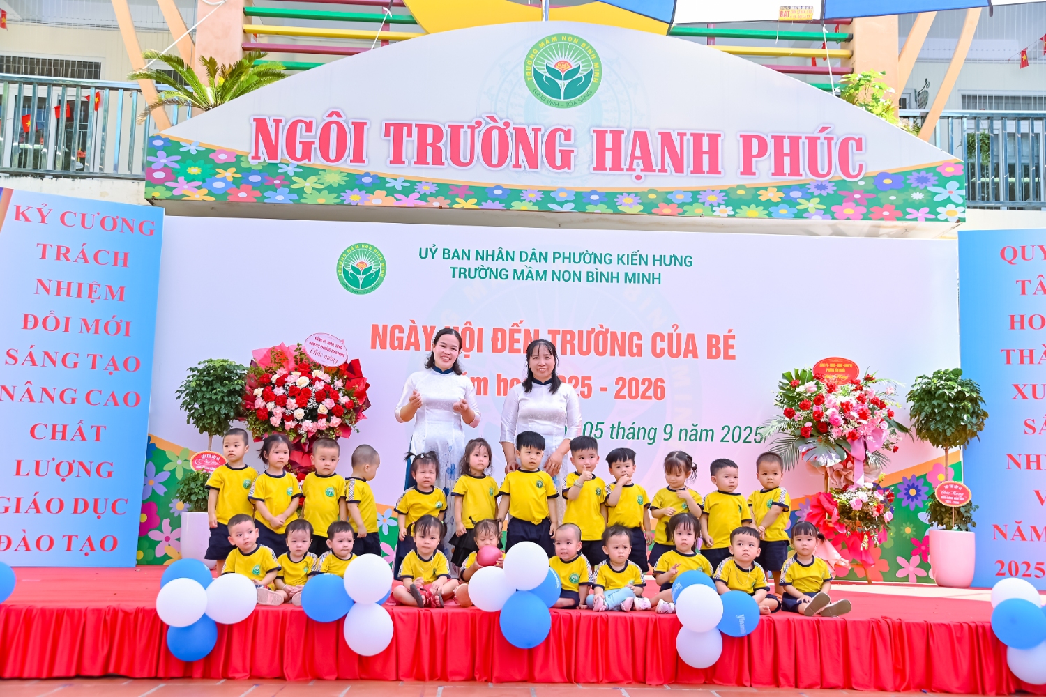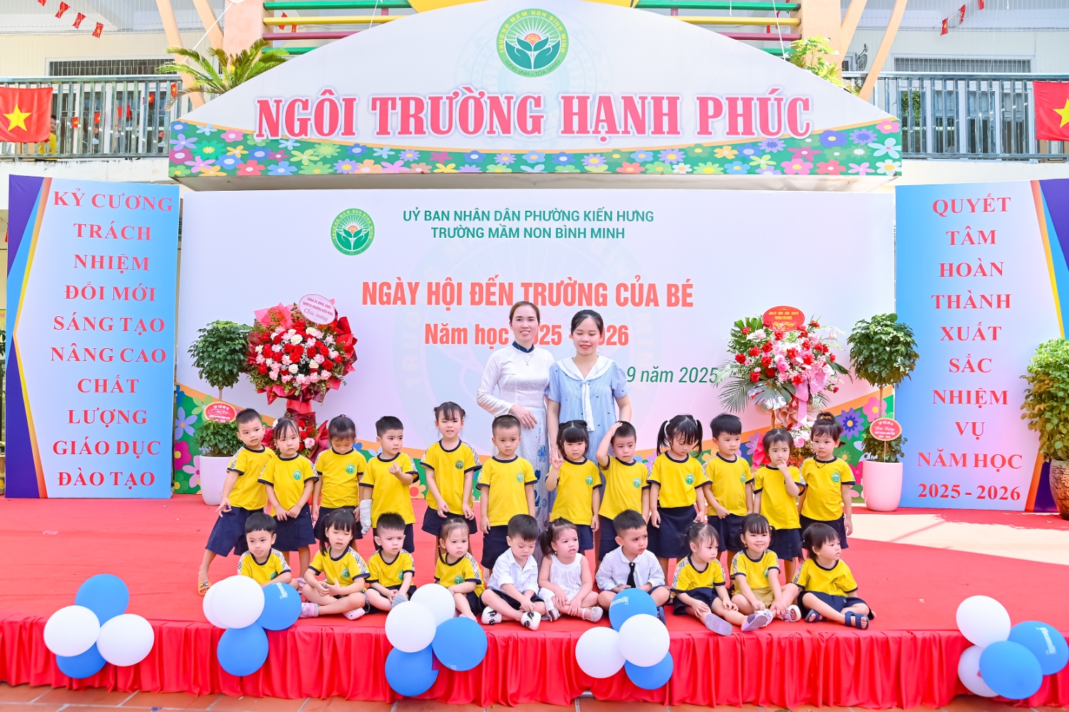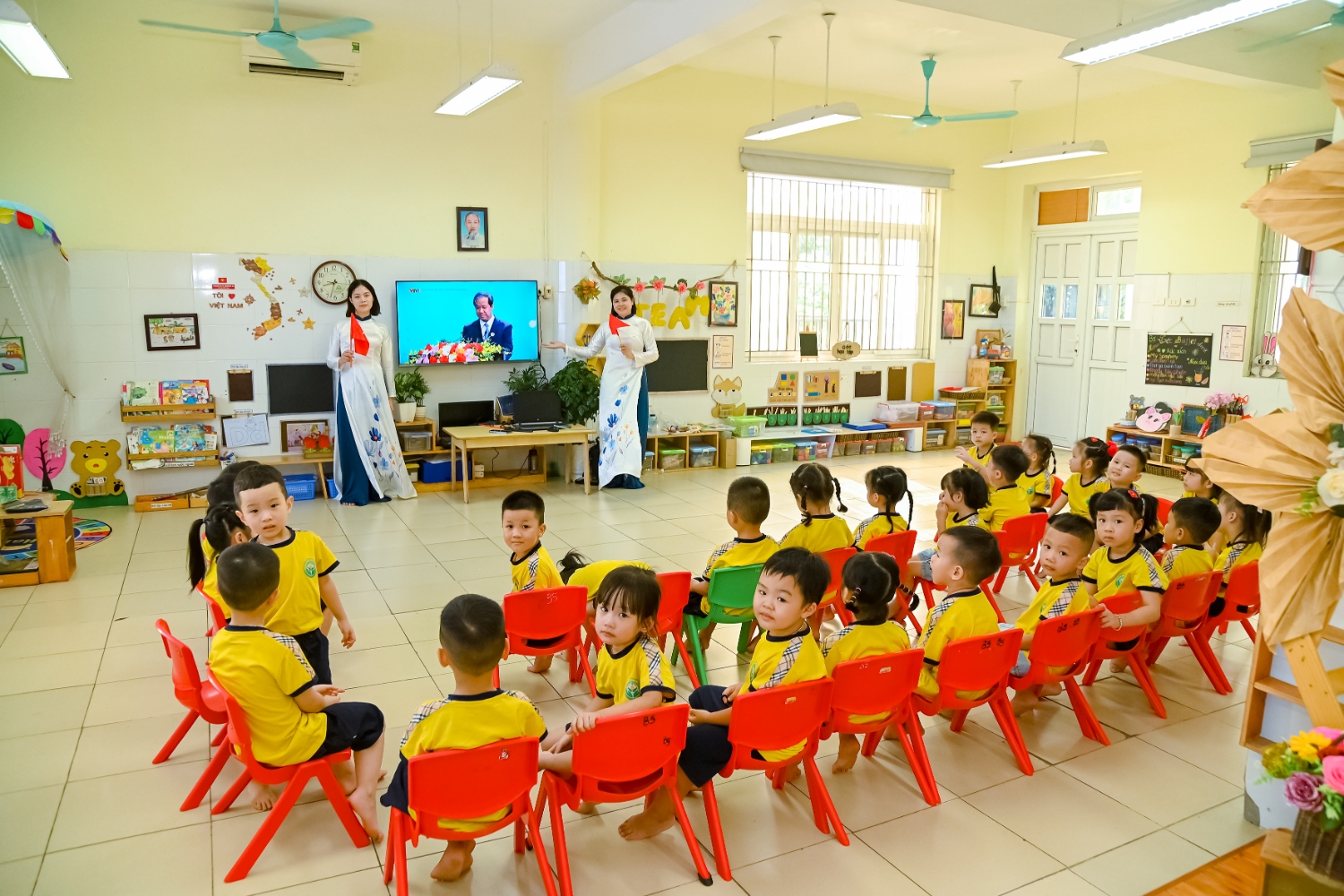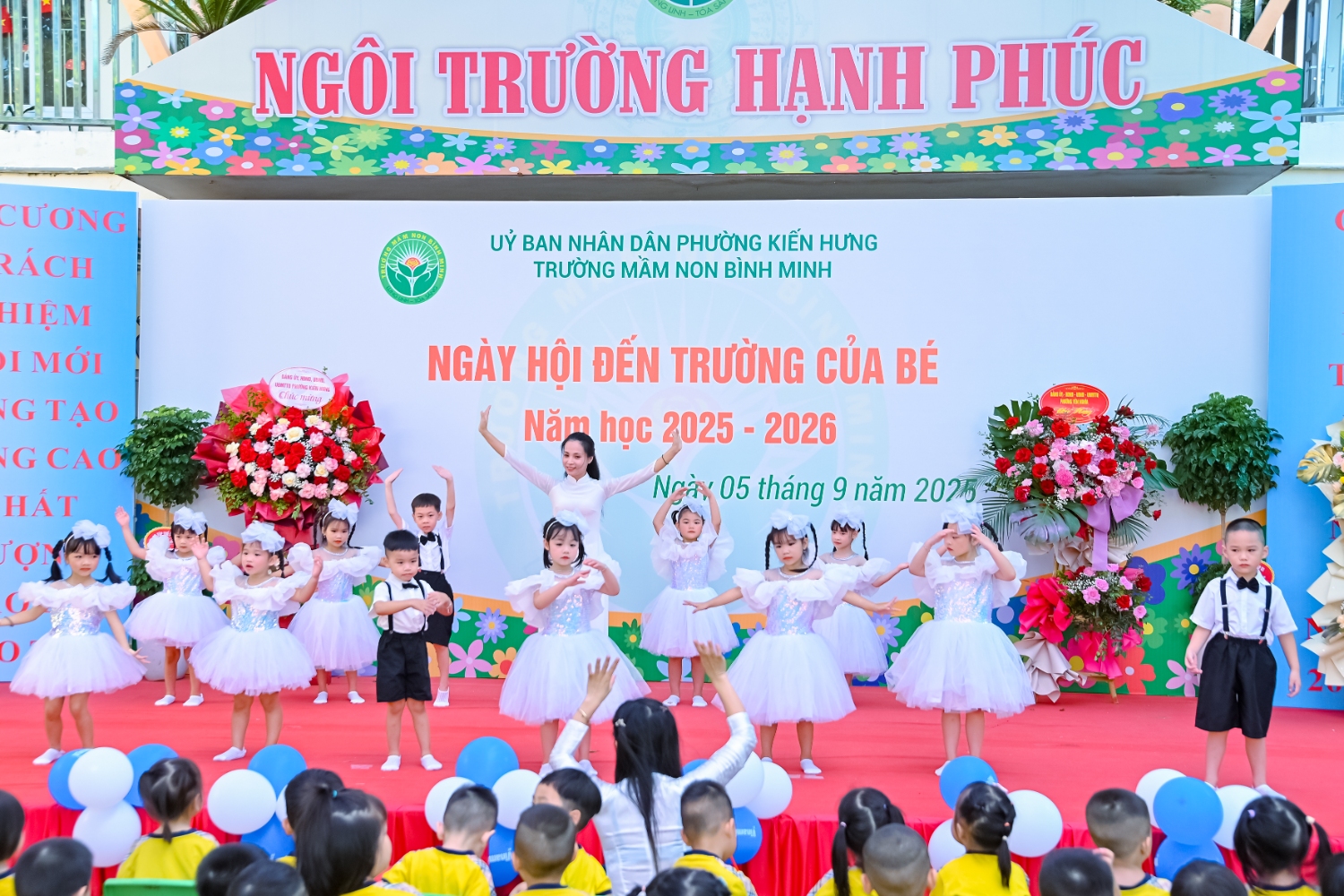 Sáng ngày 5/9/2025, trường Mầm non Bình Minh, phường Kiến Hưng, thành phố Hà Nội đã long trọng tổ chức lễ khai giảng năm học mới 2025 – 2026 trong không khí rộn ràng, hân hoan của thầy cô, phụ huynh và các em nhỏ. Sân trường được trang hoàng rực rỡ với cờ hoa, bóng bay và những tiết mục văn nghệ ngộ nghĩnh, đáng yêu do chính các bé biểu diễn. Buổi lễ diễn ra ấm áp, trang trọng nhưng vẫn gần gũi, tạo cho các con một kỷ niệm đầu năm học thật vui tươi và tràn đầy hứng khởi. Năm học mới, tập thể cán bộ, giáo viên và học sinh trường Mầm non Bình Minh quyết tâm tiếp tục phấn đấu, xây dựng môi trường học tập an toàn, thân thiện, góp phần nâng cao chất lượng giáo dục, để mỗi ngày đến trường thực sự là một ngày vui.