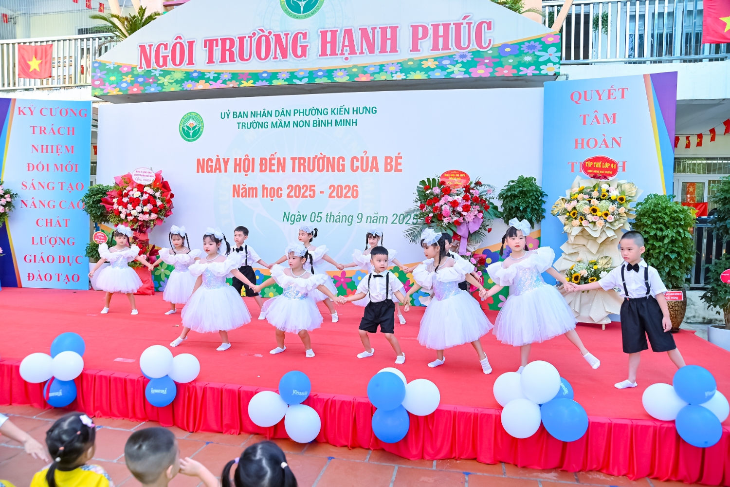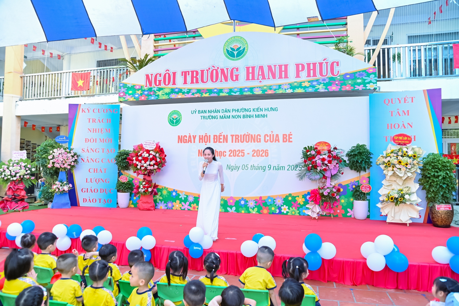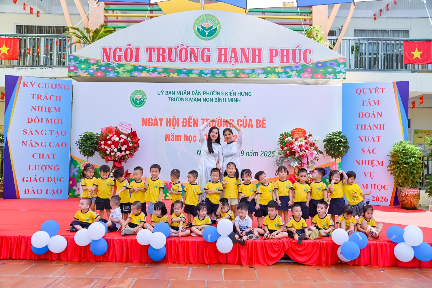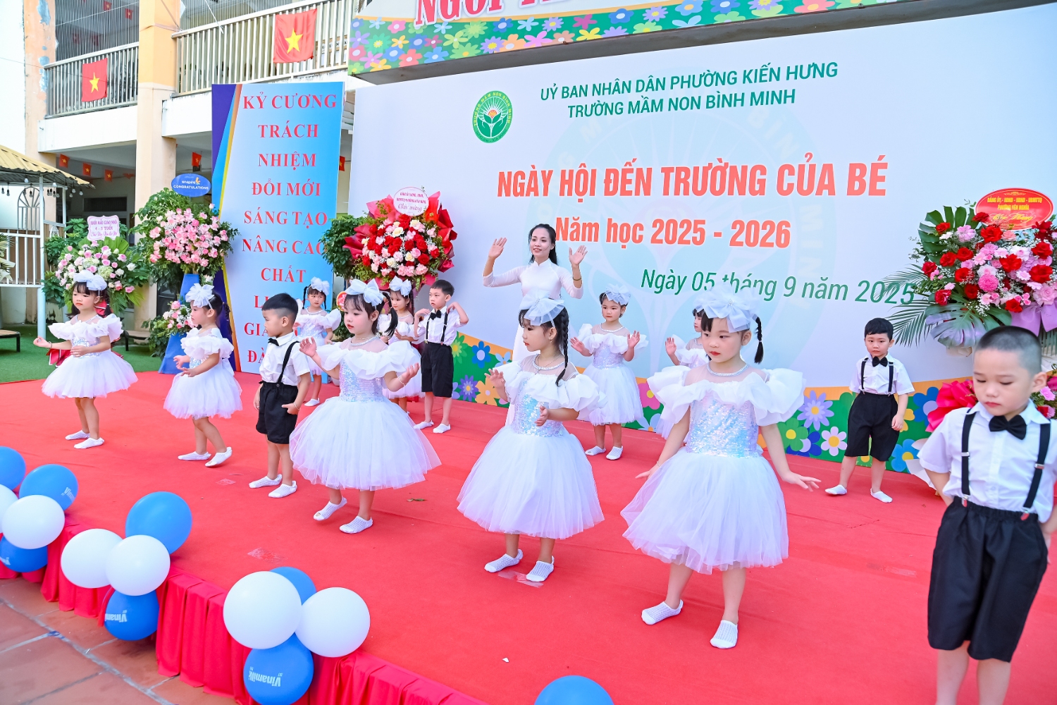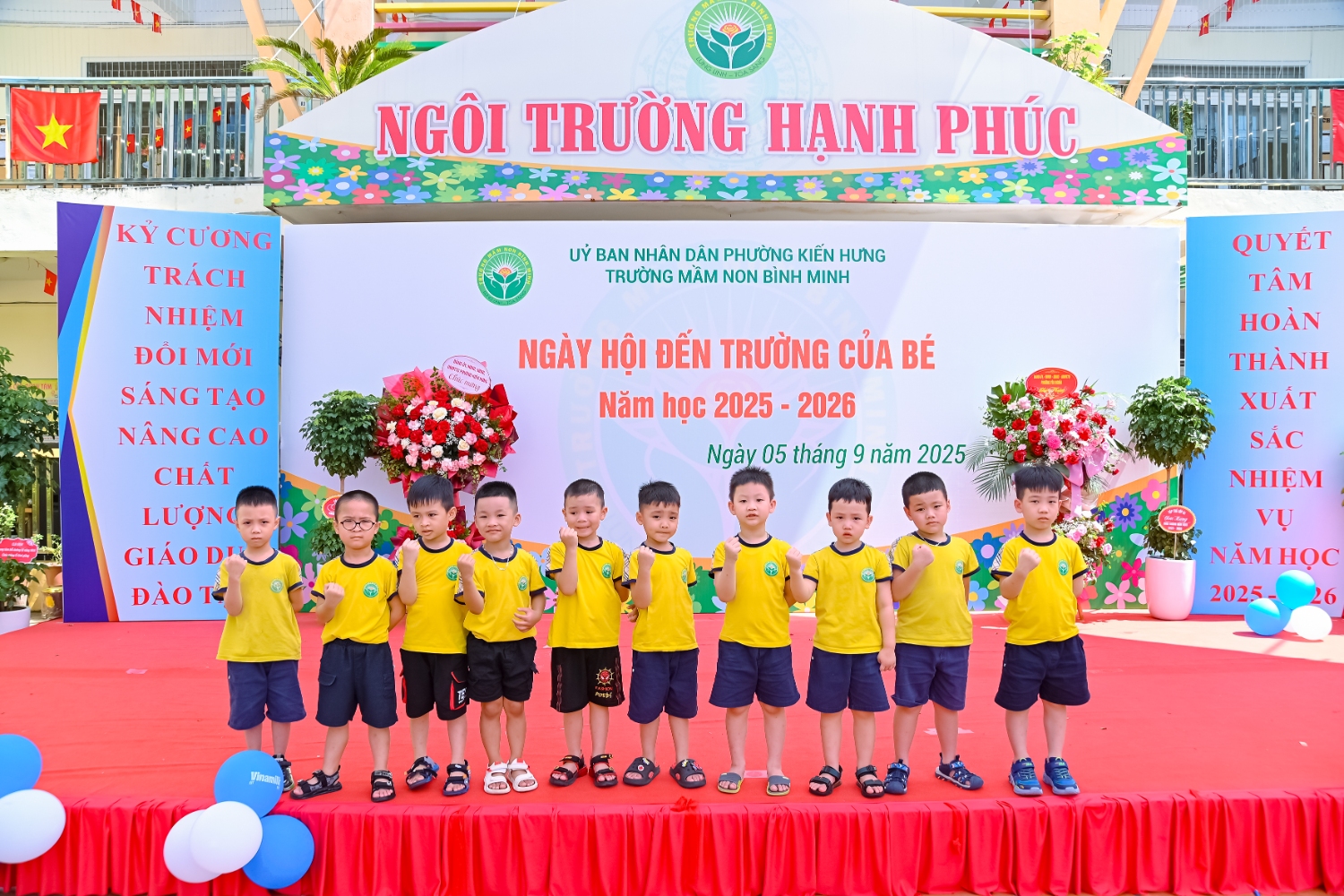 Sáng ngày 5/9/2025, trường Mầm non Bình Minh, phường Kiến Hưng, thành phố Hà Nội đã long trọng tổ chức lễ khai giảng năm học mới 2025 – 2026 trong không khí rộn ràng, hân hoan của thầy cô, phụ huynh và các em nhỏ. Sân trường được trang hoàng rực rỡ với cờ hoa, bóng bay và những tiết mục văn nghệ ngộ nghĩnh, đáng yêu do chính các bé biểu diễn. Buổi lễ diễn ra ấm áp, trang trọng nhưng vẫn gần gũi, tạo cho các con một kỷ niệm đầu năm học thật vui tươi và tràn đầy hứng khởi. Năm học mới, tập thể cán bộ, giáo viên và học sinh trường Mầm non Bình Minh quyết tâm tiếp tục phấn đấu, xây dựng môi trường học tập an toàn, thân thiện, góp phần nâng cao chất lượng giáo dục, để mỗi ngày đến trường thực sự là một ngày vui.