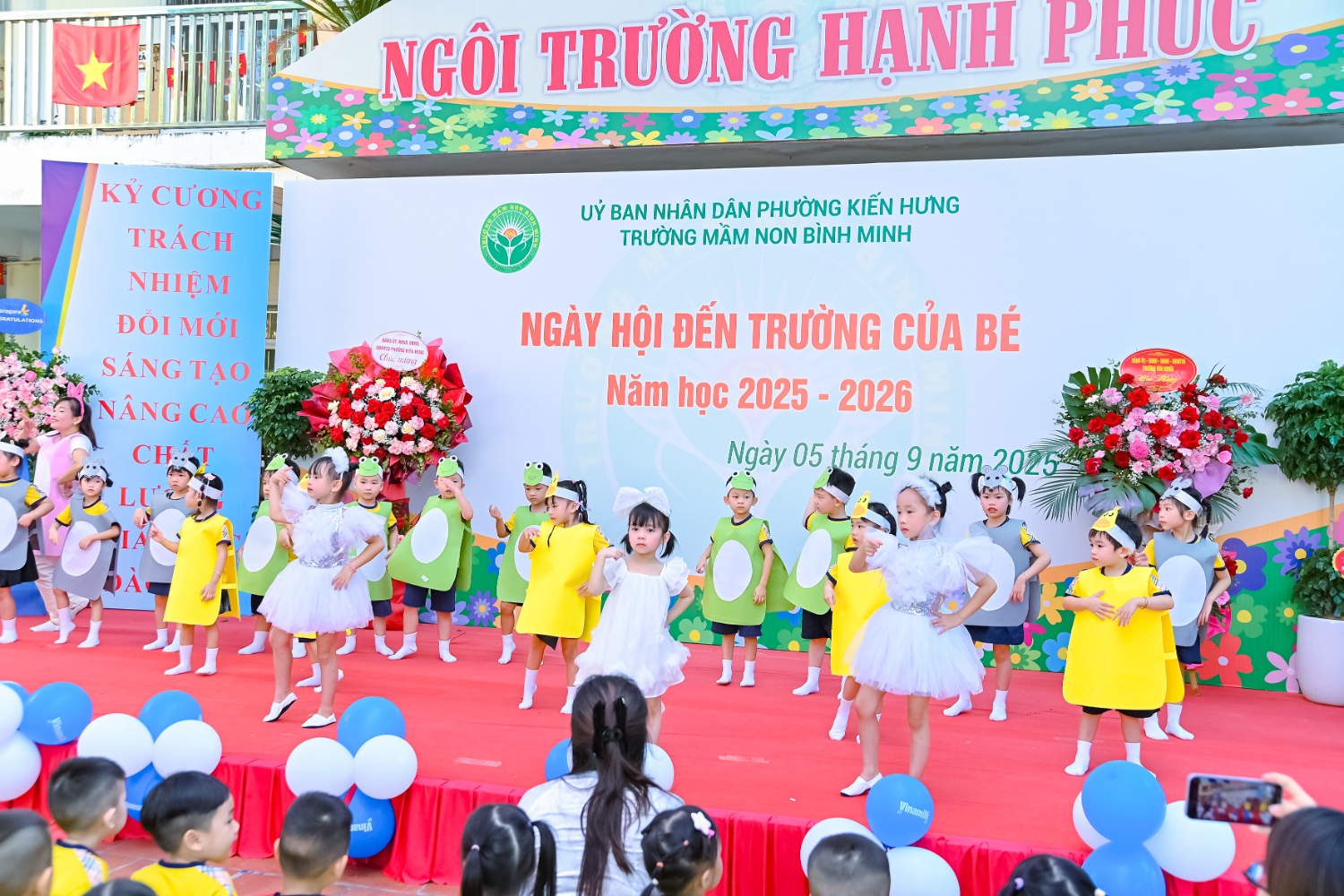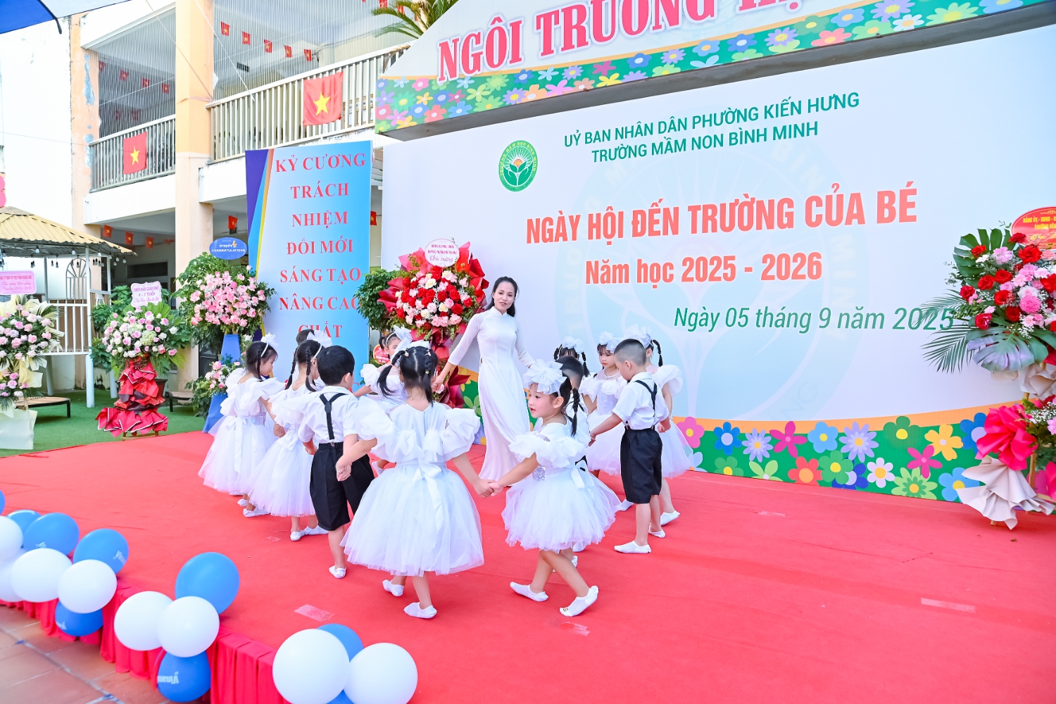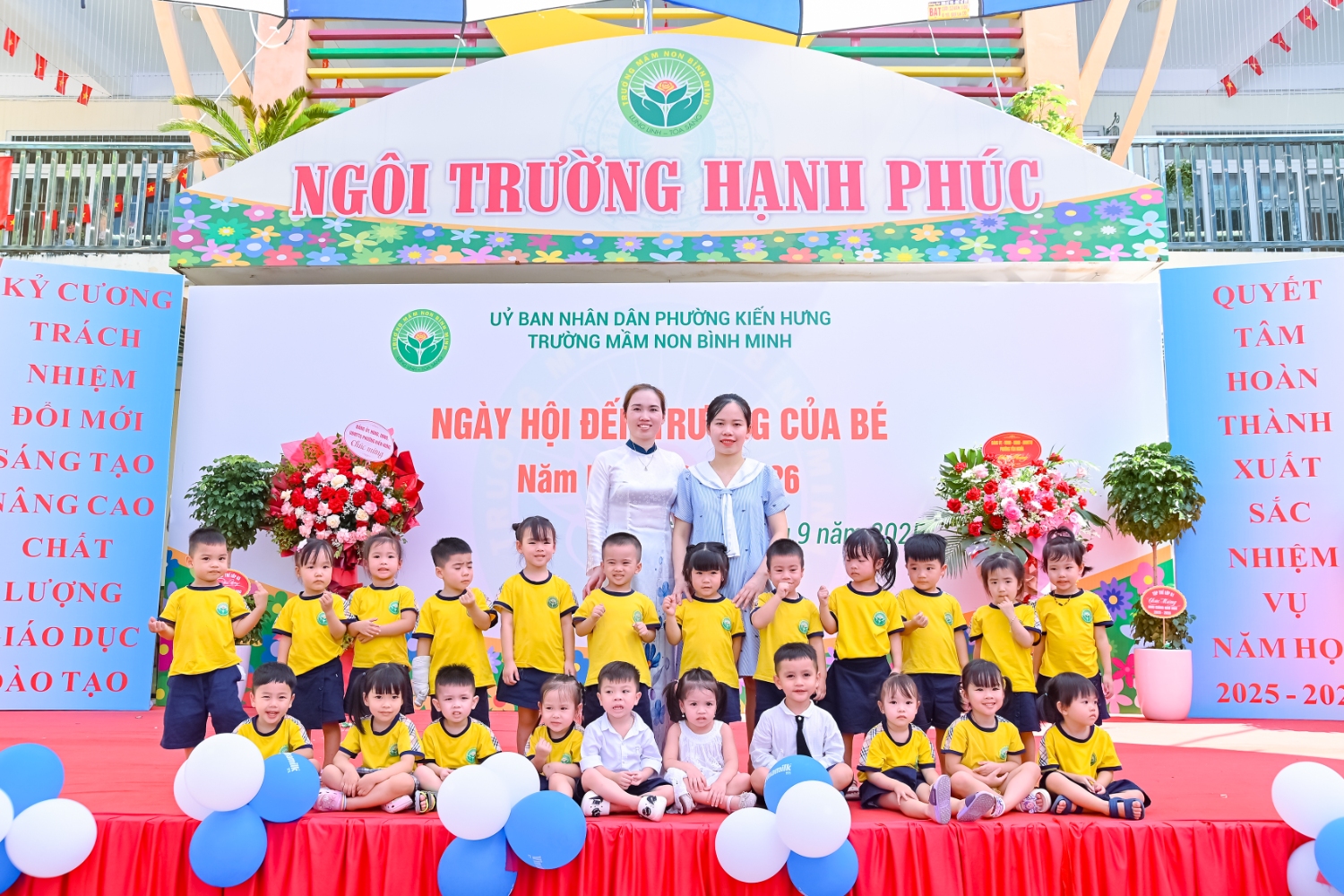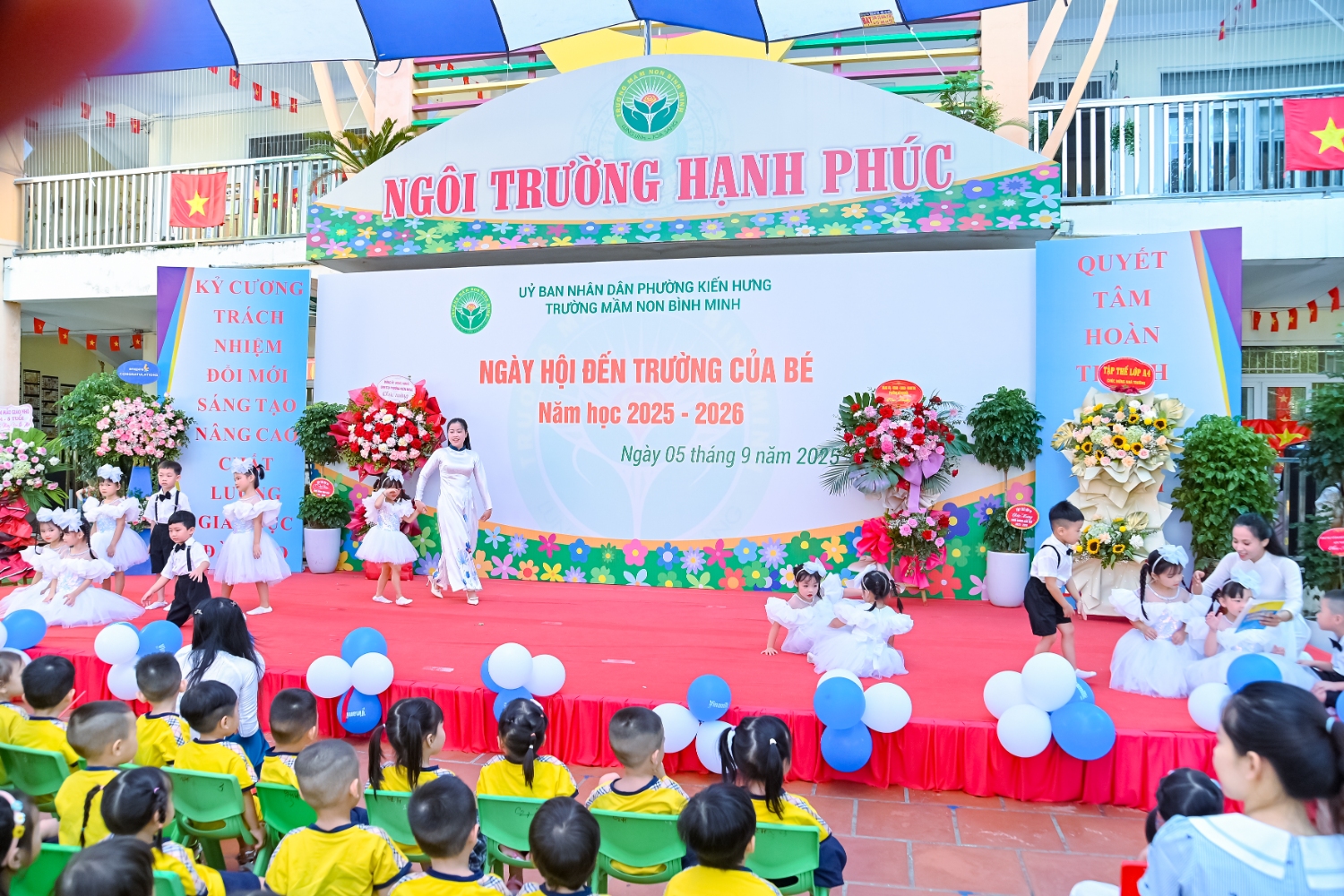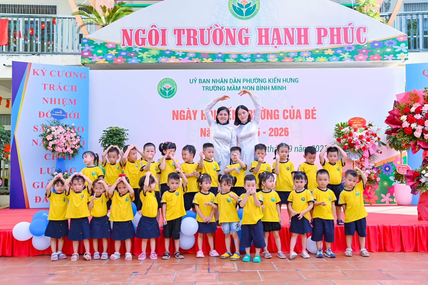 Sáng ngày 5/9/2025, trường Mầm non Bình Minh, phường Kiến Hưng, thành phố Hà Nội đã long trọng tổ chức lễ khai giảng năm học mới 2025 – 2026 trong không khí rộn ràng, hân hoan của thầy cô, phụ huynh và các em nhỏ. Sân trường được trang hoàng rực rỡ với cờ hoa, bóng bay và những tiết mục văn nghệ ngộ nghĩnh, đáng yêu do chính các bé biểu diễn. Buổi lễ diễn ra ấm áp, trang trọng nhưng vẫn gần gũi, tạo cho các con một kỷ niệm đầu năm học thật vui tươi và tràn đầy hứng khởi. Năm học mới, tập thể cán bộ, giáo viên và học sinh trường Mầm non Bình Minh quyết tâm tiếp tục phấn đấu, xây dựng môi trường học tập an toàn, thân thiện, góp phần nâng cao chất lượng giáo dục, để mỗi ngày đến trường thực sự là một ngày vui.
