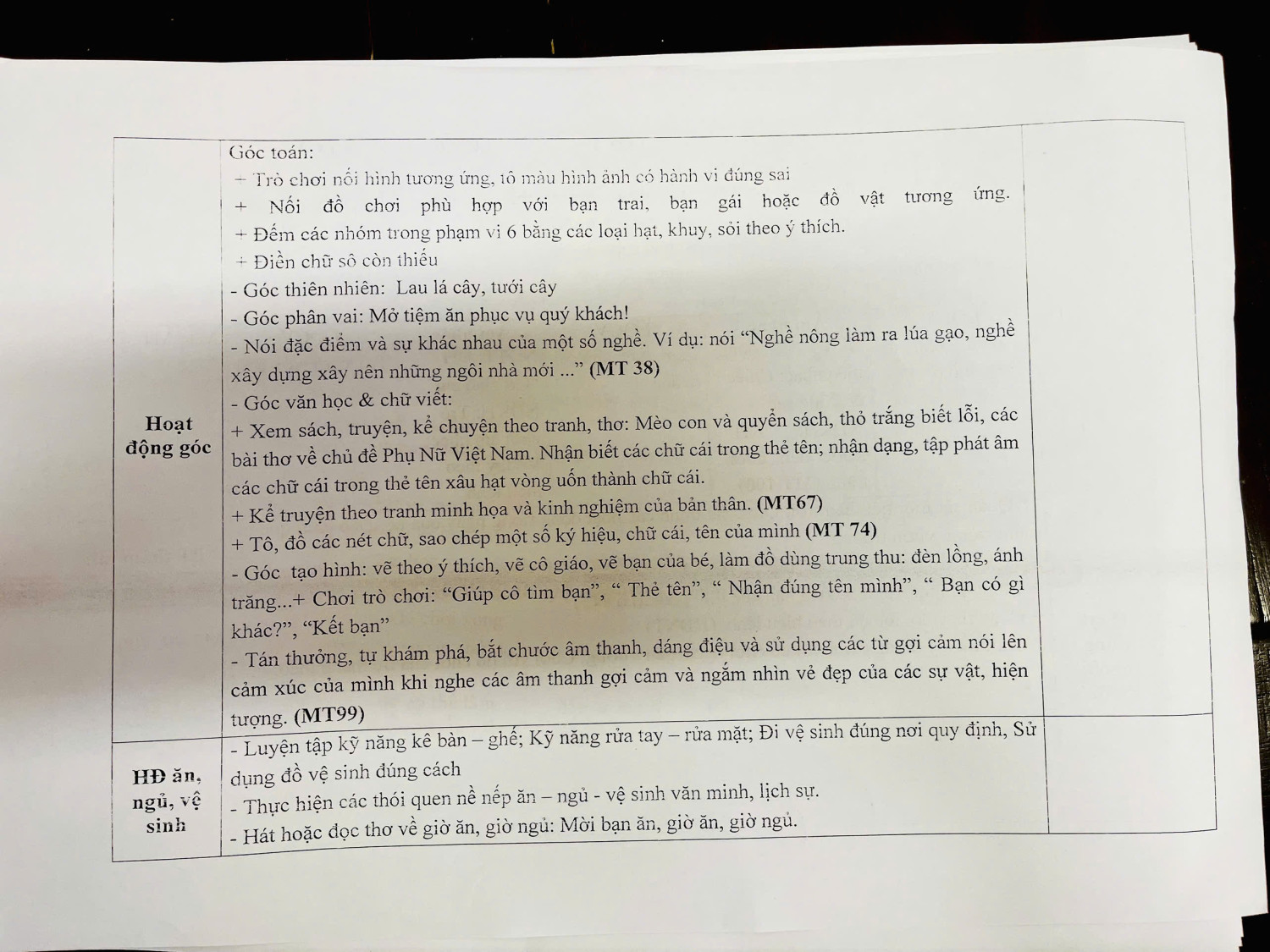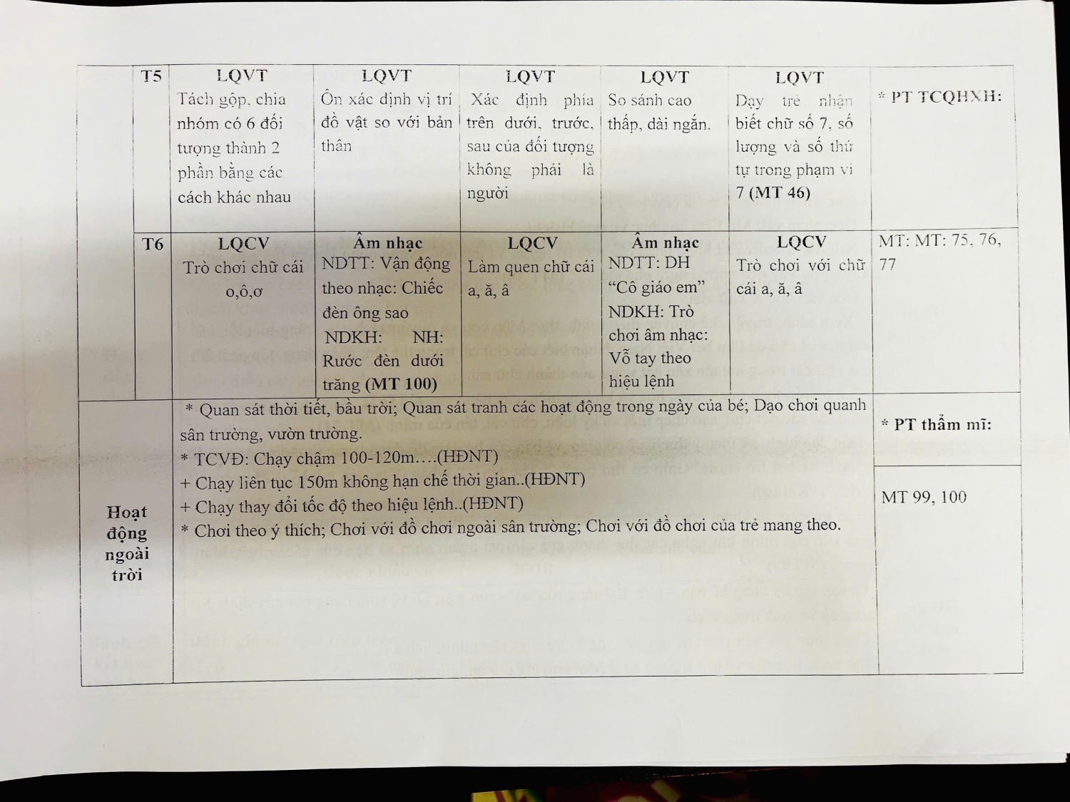 Kế hoạch giáo dục lớp MGL A5