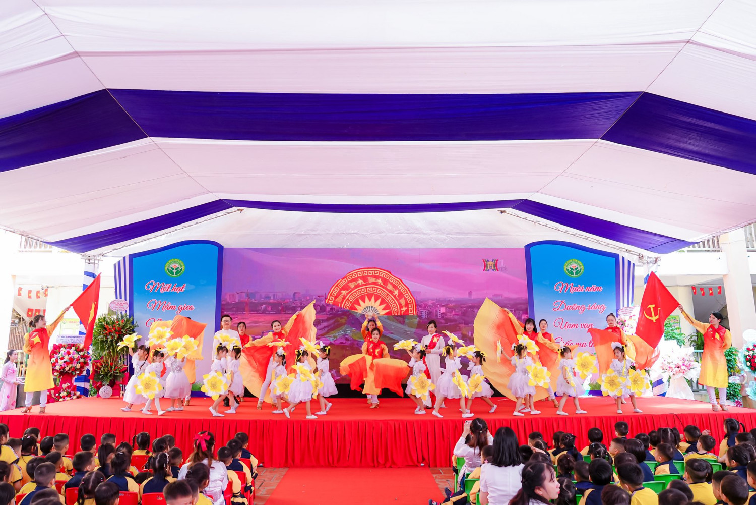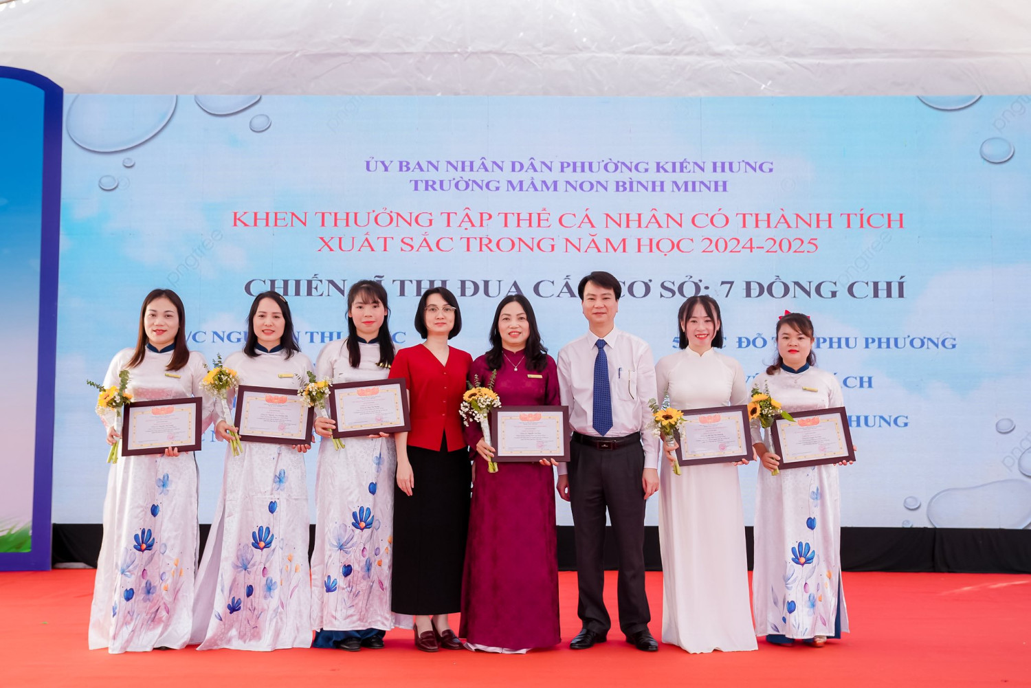 Trong buổi lễ trang trọng, đại diện lãnh đạo phường và phòng chuyên môn đã ghi nhận những đóng góp của nhà trường đối với sự phát triển giáo dục địa phương. Những bó hoa tươi thắm được gửi tặng tập thể cán bộ, giáo viên như lời cảm ơn chân thành dành cho những “người đưa đò thầm lặng”, luôn tận tâm chăm sóc và dạy dỗ những mầm non bé nhỏ bằng tình yêu thương và sự trách nhiệm.