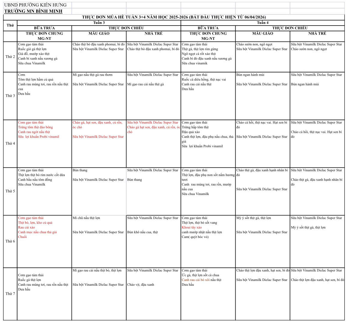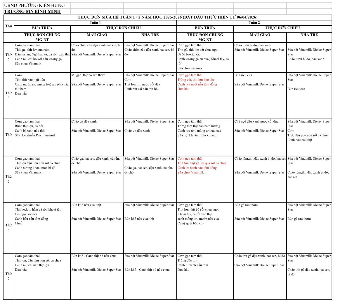 Chế độ dinh dưỡng mùa hè: Khỏe mạnh từ bên trong, rạng rỡ bên ngoài Thực đơn mùa hè của chúng tôi không chỉ là những bữa ăn ngon, mà còn là sự tính toán kỹ lưỡng về hàm lượng dinh dưỡng để đảm bảo trẻ phát triển toàn diện: Tăng cường Vitamin & Khoáng chất: Bổ sung tối đa Vitamin A, C từ rau củ quả tươi giúp tăng cường hệ miễn dịch, bảo vệ trẻ trước các bệnh dịch mùa hè.